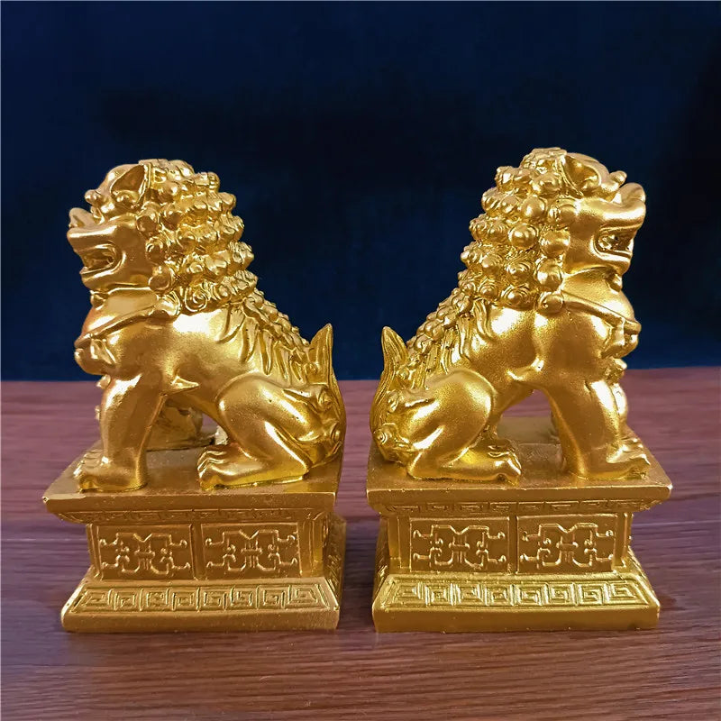 2Pcs Gold Fu Foo Dogs Lions Statues Feng Shui Man-made Jade Stone Buddha Dragon Sculpture Figurines Statue Home Decoration